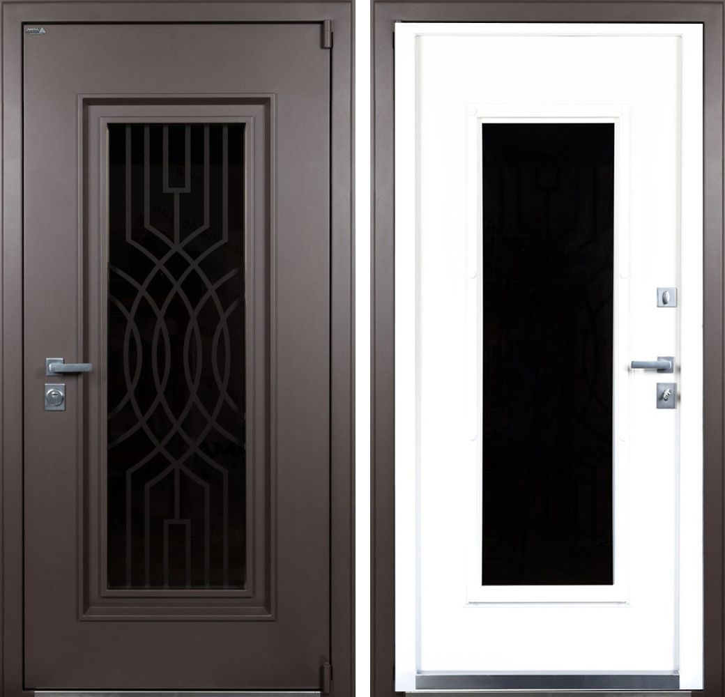 СБ-1 с окном, стеклопакет 2-х камерный, тонировка бронза зеркальная + резка Самурай внутри стеклопакета в цвет двери